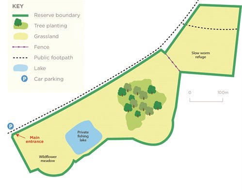 At the entrance a wildflower meadow has been planted and will be cut annually for hay. This area will be monitored and further flower plugs will be planted if needed. A fishing club uses the private lake.